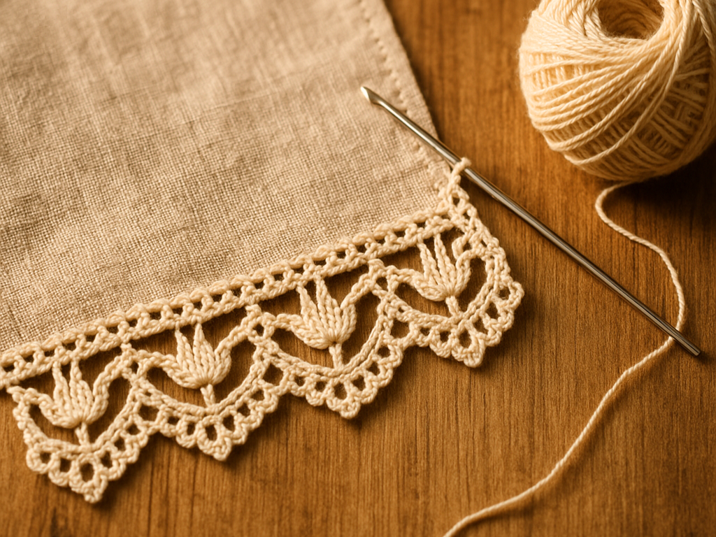 Small modern Oya crochet edging: chain arches + picots, with tiny "tulips" (3D clusters) at intervals – perfect for scarves, shawls, or children's dresses.