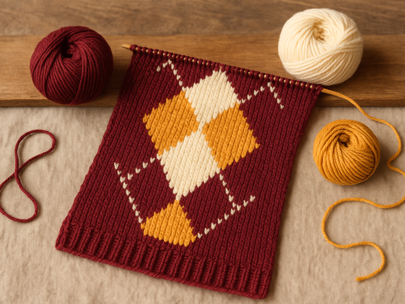Classic Argyle is made with intarsia knitting. Each color block has its own yarn ball, and clean transitions keep the pattern crisp. Yarn bobbins help keep order. Crocheters can try filet or intarsia crochet for a similar diamond effect.